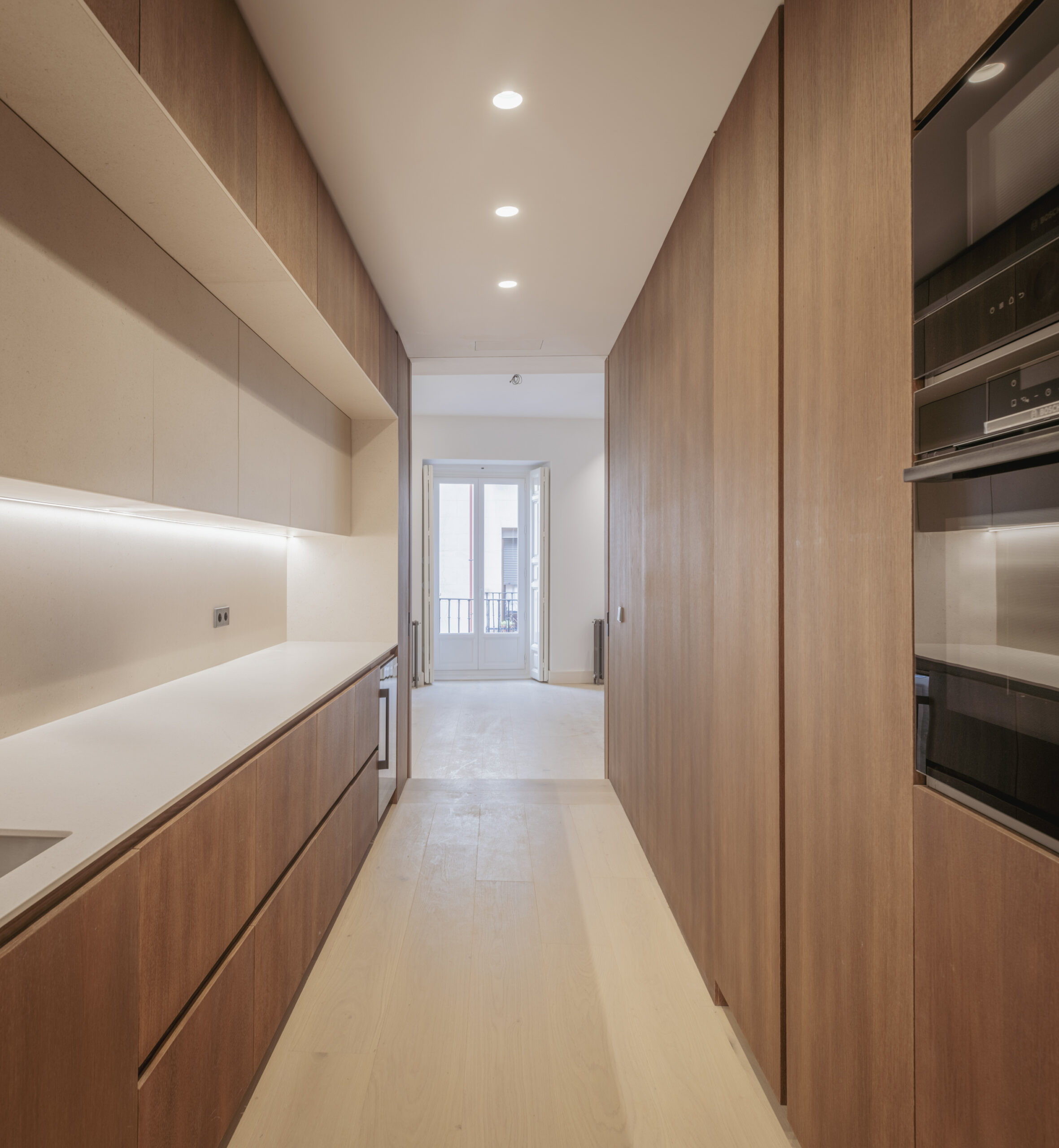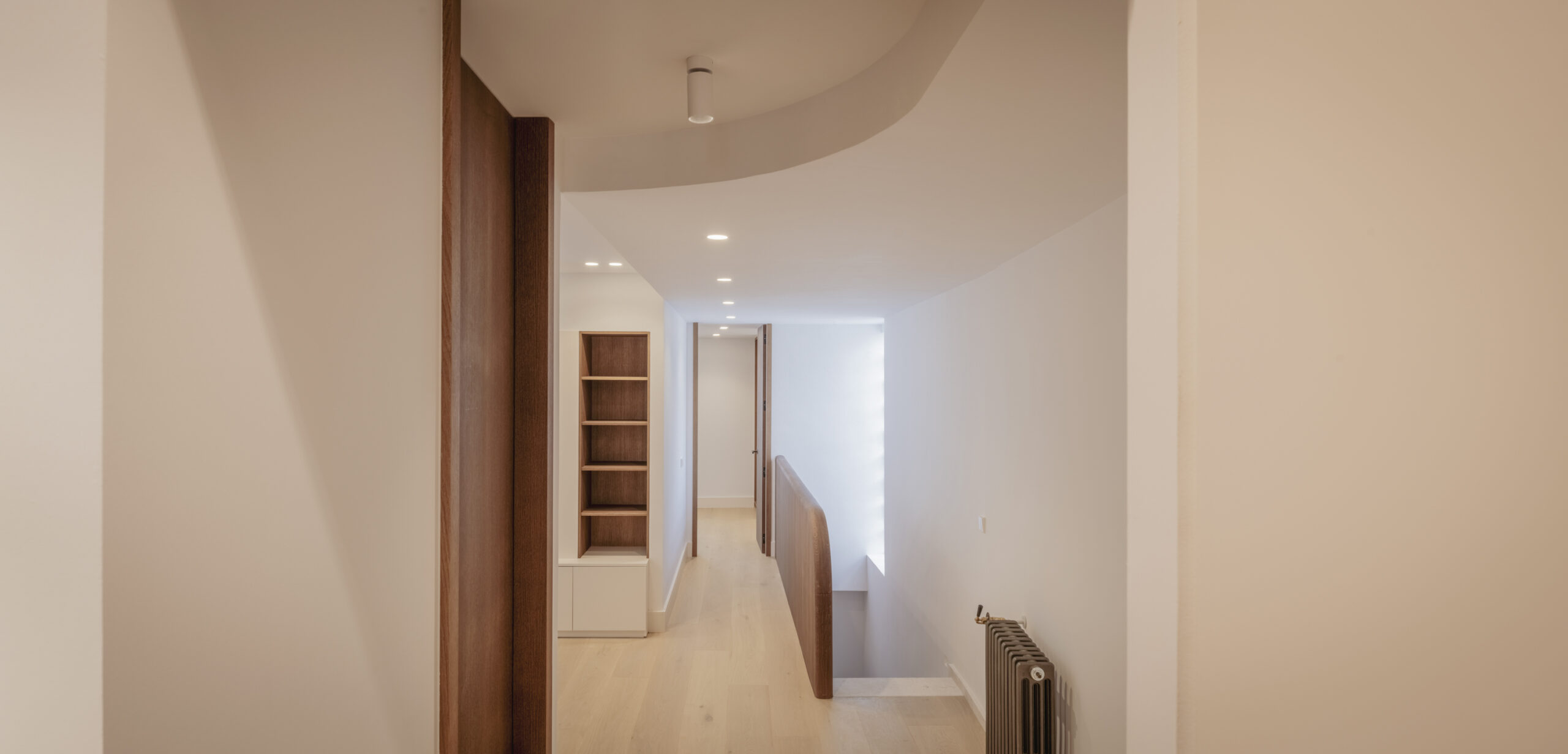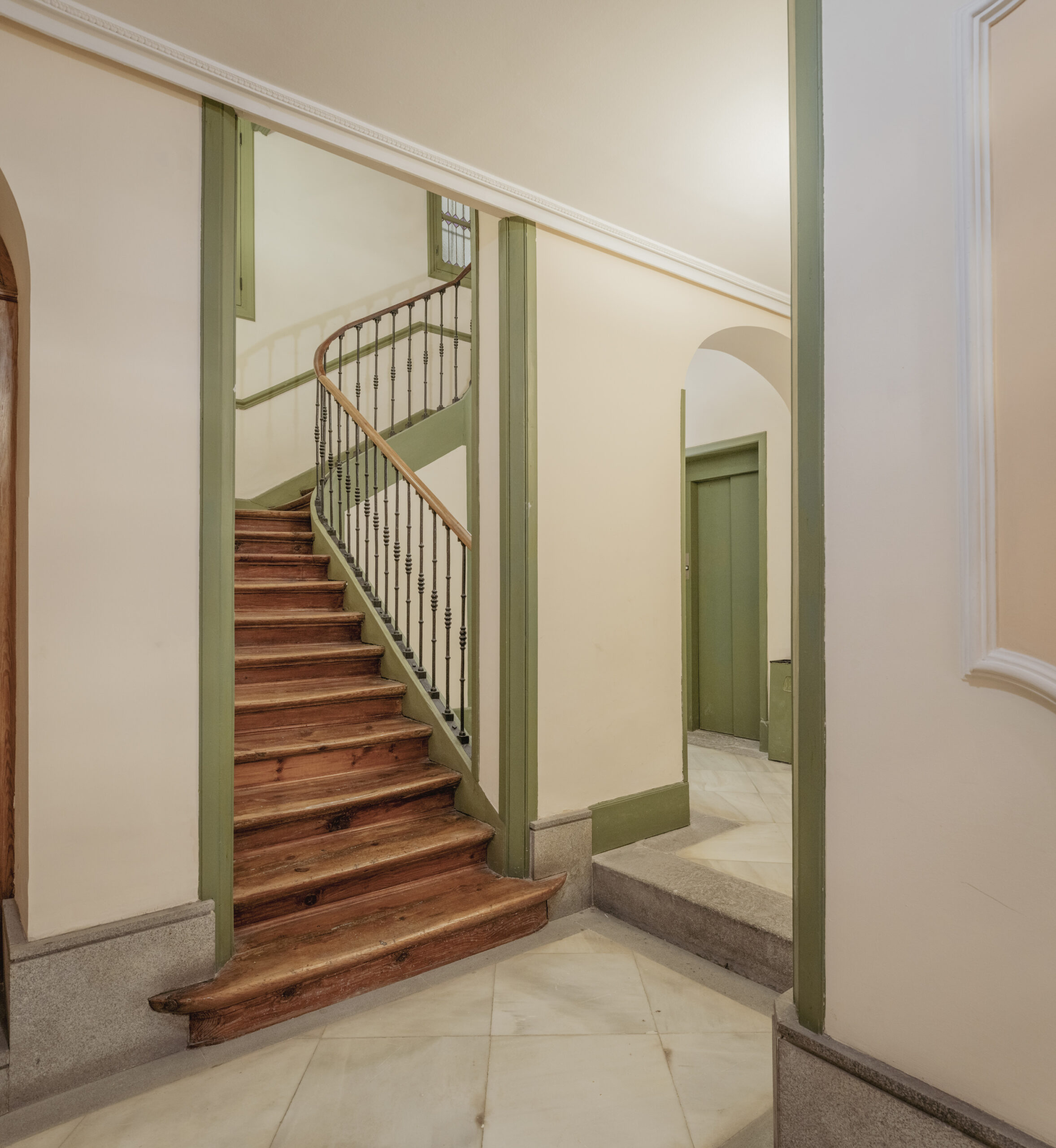 La vivienda, situada en una segunda planta con ascensor, cuenta con dos balcones a la calle, techos de más de 3 m de altura y una luz natural excepcional. Dispone de cocina y lavandería independientes, dos dormitorios con baño en suite y vestidor, y una sala de TV que articula el espacio en torno a la espectacular escalera que conduce a la master suite, garantizando privacidad y silencio.