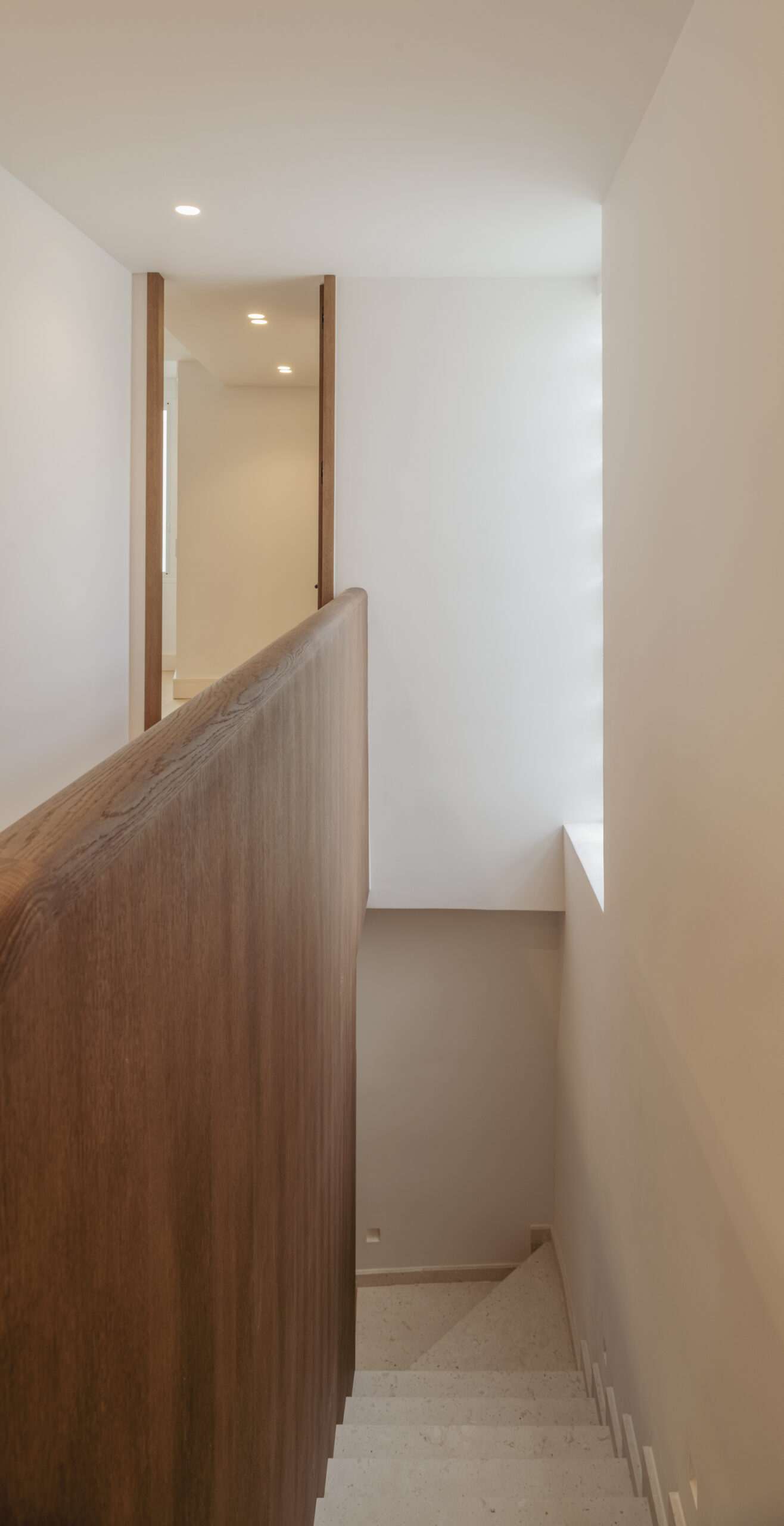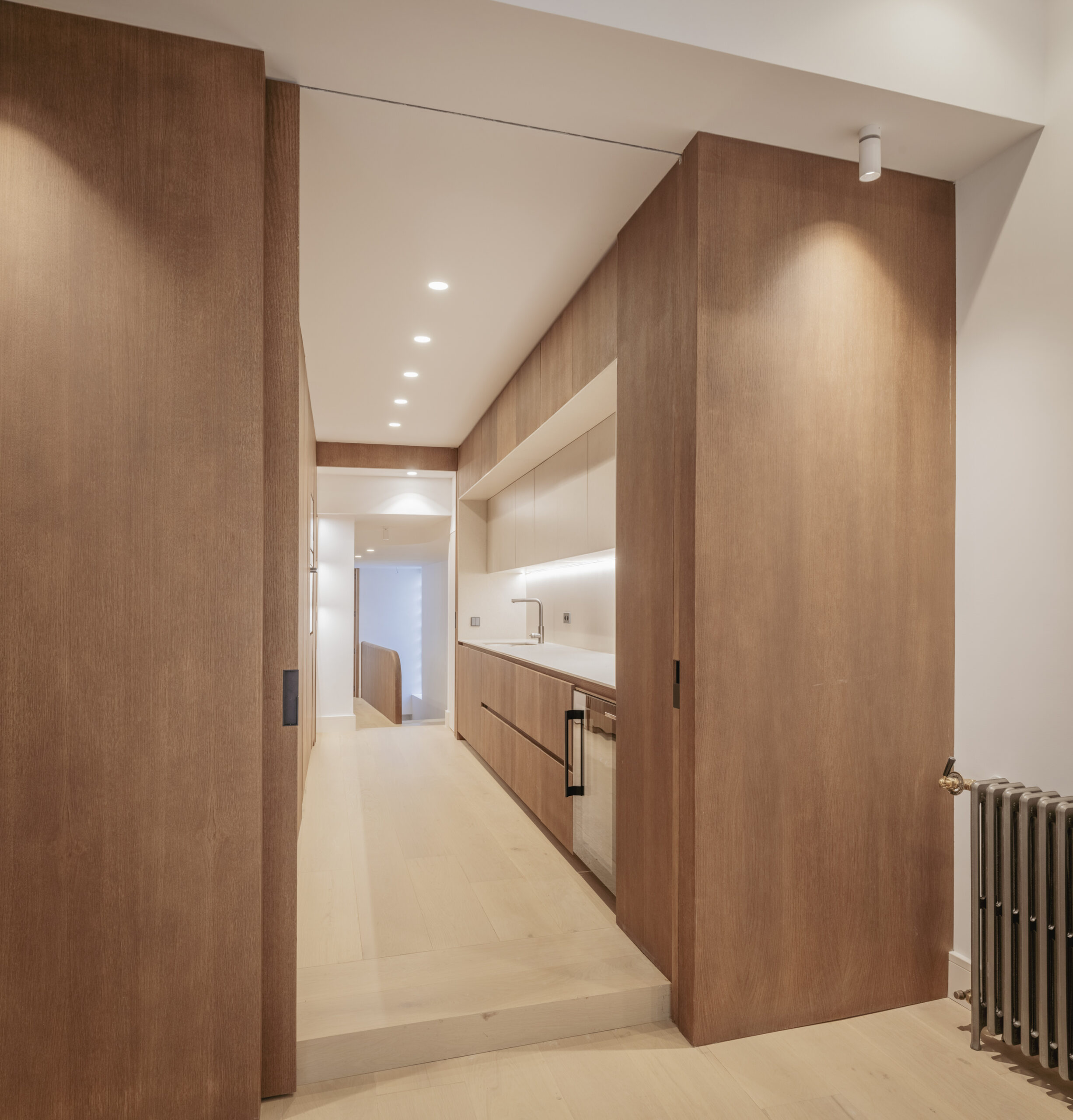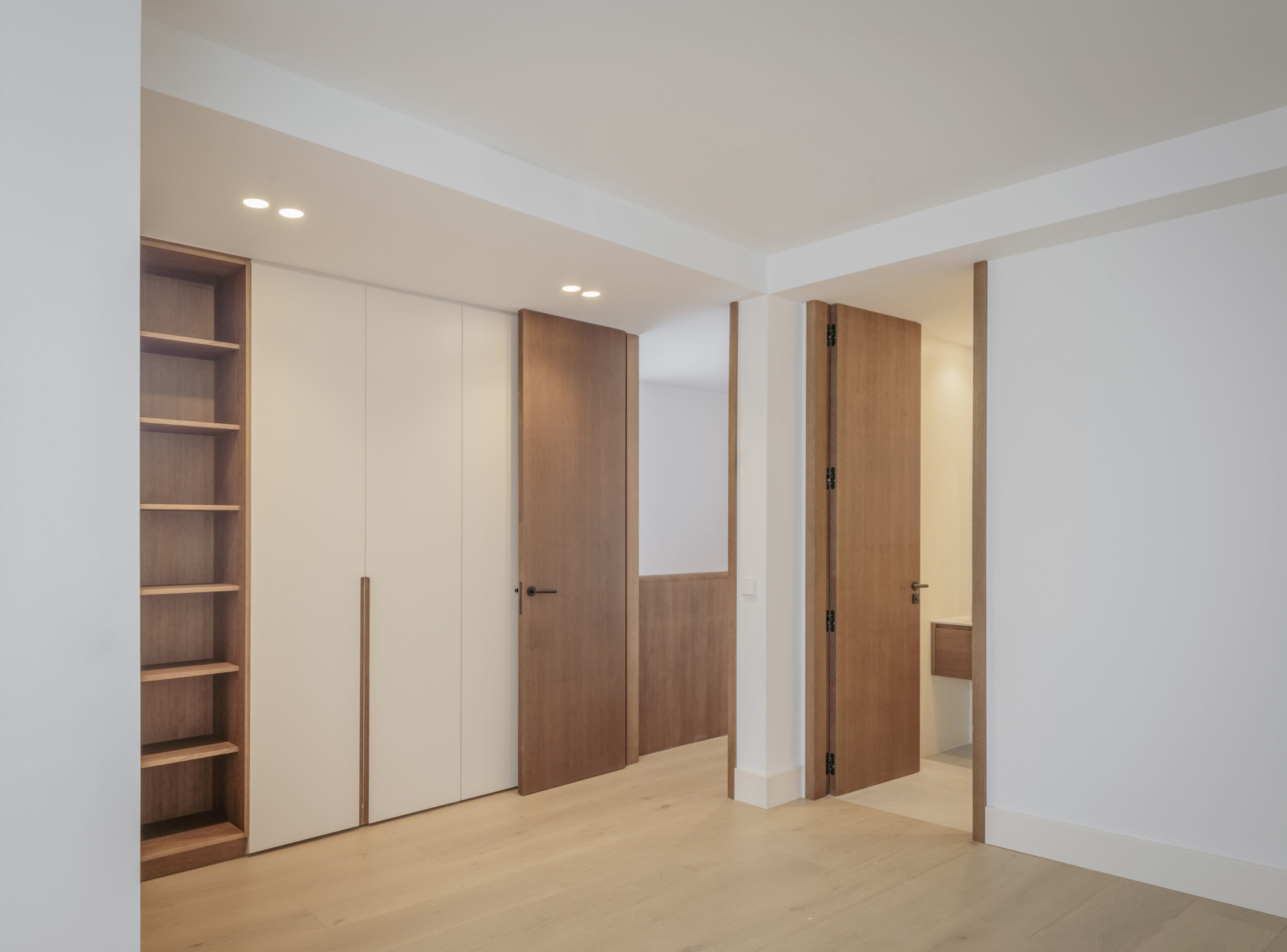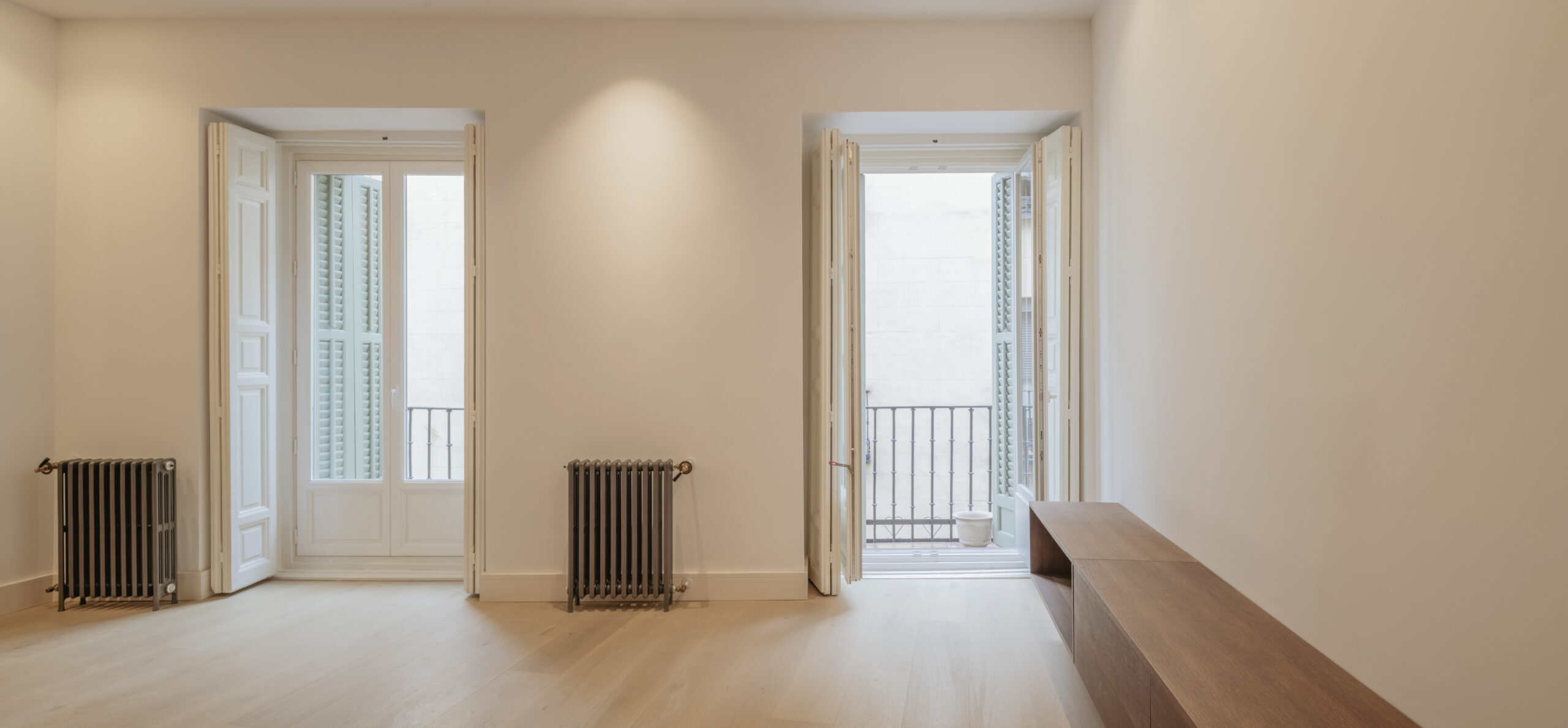 La vivienda, situada en una segunda planta con ascensor, cuenta con dos balcones a la calle, techos de más de 3 m de altura y una luz natural excepcional. Dispone de cocina y lavandería independientes, dos dormitorios con baño en suite y vestidor, y una sala de TV que articula el espacio en torno a la espectacular escalera que conduce a la master suite, garantizando privacidad y silencio.